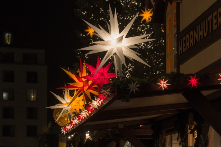 Herrnhuter Sterne aus sächsischer Herstellung erleuchten die Dresdner Weihnachtsmärkte.