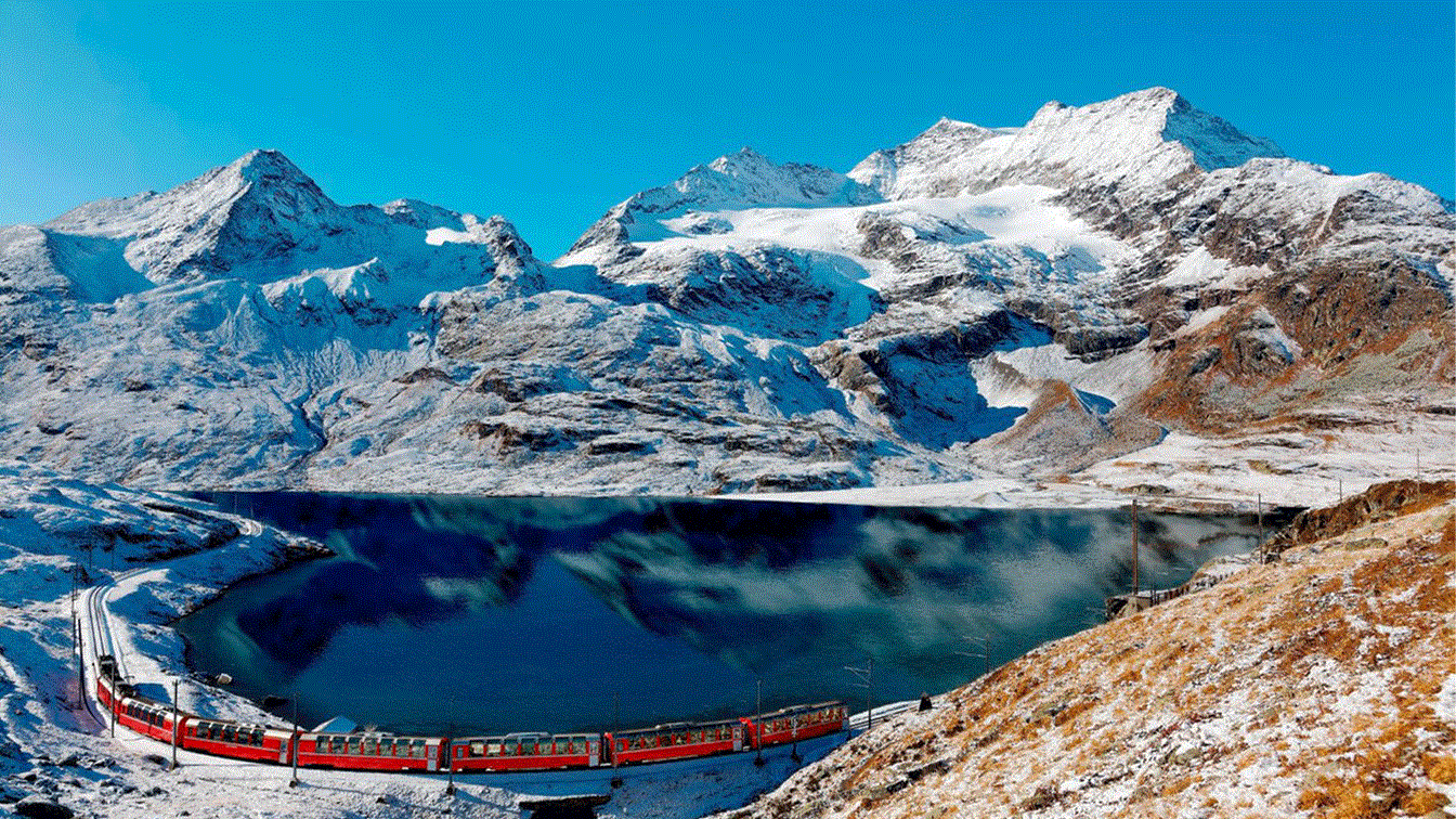 The phrase “romance of the rails” perfectly suits the legendary Bernina Express train, which offers travellers awe-inspiring views of the region’s glaciers and frozen lakes.