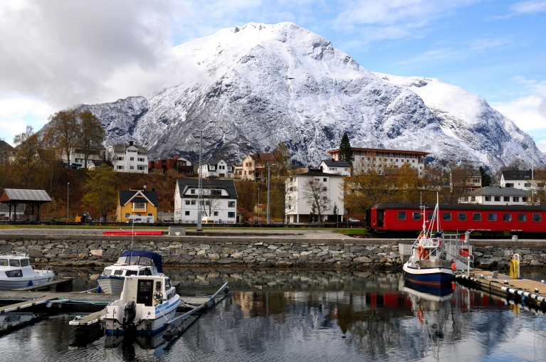The Rauma line pulls away from its station in Åndalsnes, Norway.