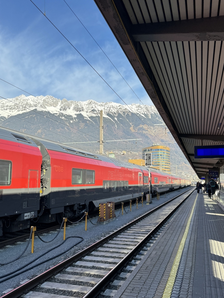 When we arrived in Innsbruck, we disembarked the European Sleeper and switched to a Railjet that took us from Innsbruck to Verona. From Verona, we took another regional train to Venice. This alteration from the European Sleeper's original schedule, which we had been informed of prior to boarding the train, presented my fellow passengers and I with the opportunity to stretch and breathe in the fresh mountain air at Innsbruck’s Haubtbahnof while chatting with other travellers.