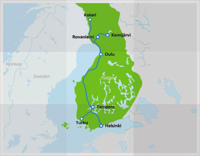 The Santa Claus Express runs from Helsinki and Turku in the south to Rovaniemi, Kemijärvi and Kolari in Finnish Lapland. In less than fifteen hours, you will find yourself in a magical place where the sun doesn’t set for weeks in summer and doesn’t rise for weeks in winter. Kemijärvi and Kolari are both above the magic Polar Circle. Once you get to Rovaniemi, where you can gaze in awe at the Northern Lights, be sure to pay a visit to Santa Claus and his reindeer at the Santa Park.
