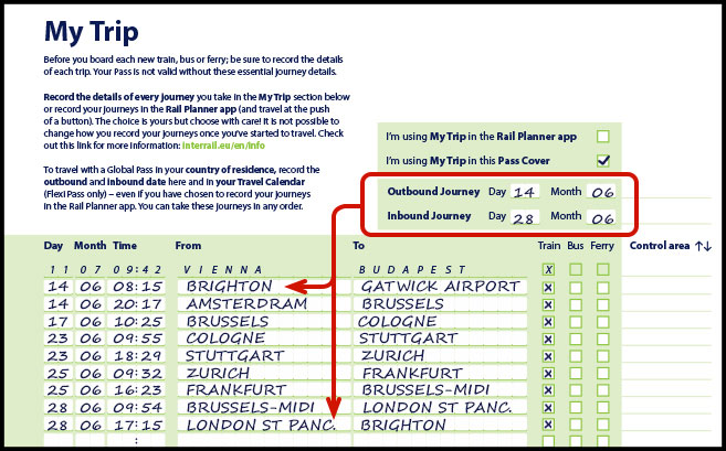 Comme à chaque fois que vous utilisez votre Pass Interrail, vous devez marquer les details de vos trajets aller et retour dans la section My Trip présente sur la pochette de votre Pass. Si vous disposez d’un Flexi Pass, vous devez marquer ces mêmes dates dans votre calendrier de voyage (voir ci-dessous).