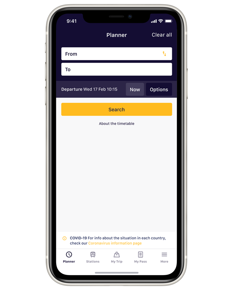 Prima di iniziare, assicurati di avere l'ultima versione della nostra app Rail Planner installata sul dispositivo. Per poter utilizzare alcune funzionalità dell'app mentre sei in viaggio con il tuo pass mobile, ti servirà una connessione a Internet. Il pass mobile è supportato su Android 6.0 e versioni successive e iOS 16.0 e versioni successive.
