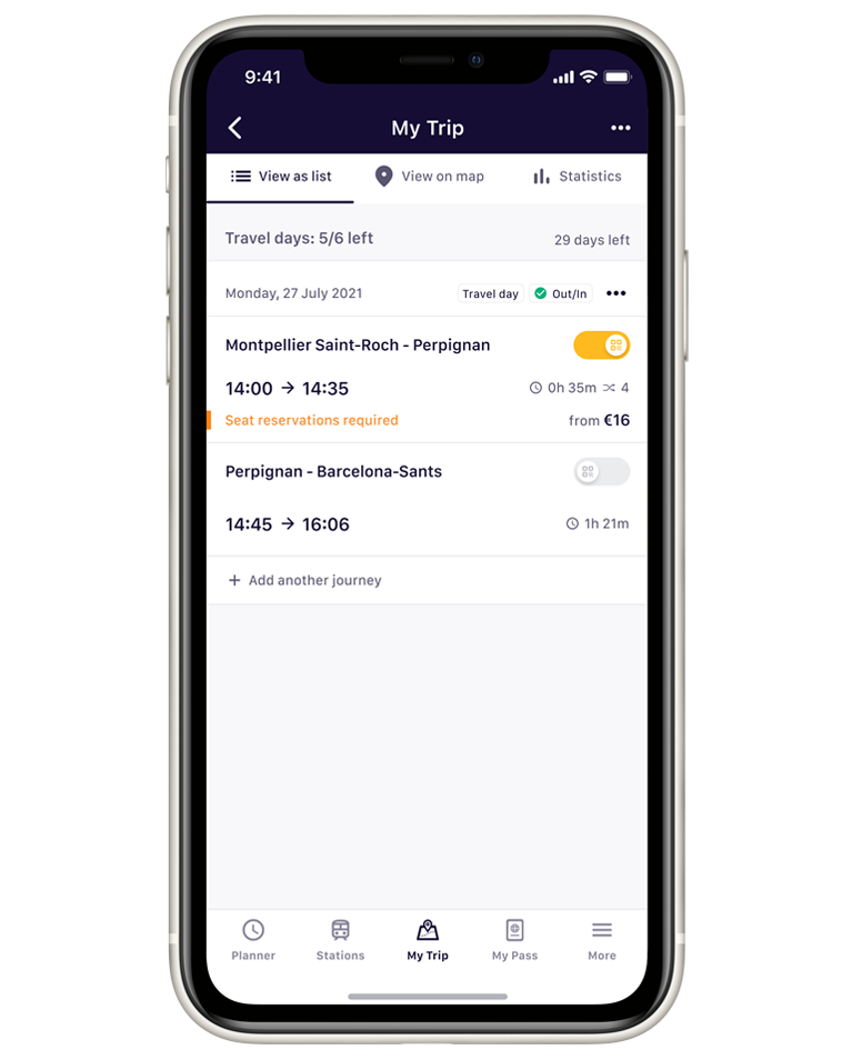 L' app ti chiederà se desideri utilizzare i viaggi di uscita e di entrata dal paese. Una volta aggiunte, le due tratte appariranno nel tuo itinerario con un simbolo “Out/In”, per consentirti di usare i treni del tuo paese di residenza. Il biglietto per il giorno scelto indicherà che hai utilizzato uno di questi due viaggi.