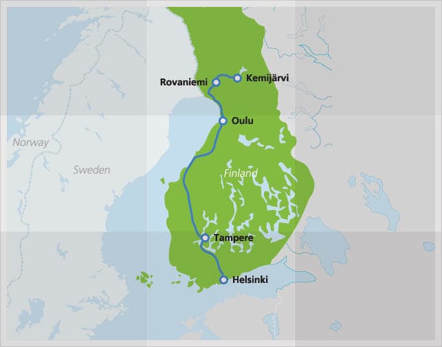 Il Santa Claus Express parte da Helsinki e Turku, a sud, fino a Rovaniemi, Kemijärvi e Kolari, nella Lapponia finlandese. In meno di quindici ore, ti troverai in un luogo magico in cui il sole non tramonta per settimane in estate e non sorge per settimane in inverno. Kemijärvi e Kolari si trovano entrambe al di sopra del magico Circolo Polare Artico. Una volta a Rovaniemi, dove ammirerai con stupore l'aurora boreale, non dimenticarti di fare una visita a Babbo Natale e alle sue renne al Santa Park.