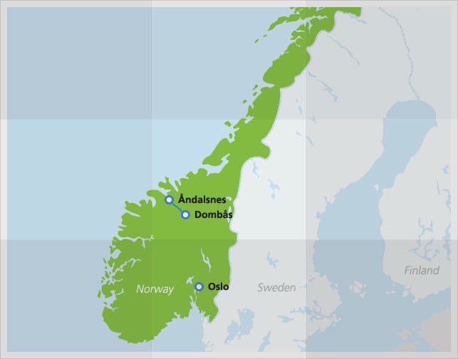 Questa tratta ferroviaria panoramica che parte da Dombås, situata tra Oslo e Trondheim, ti porta attraverso montagne pittoresche, sopra ponti maestosi, all'interno di tunnel sinuosi e sotto la parete rocciosa più alta d'Europa, il Trollveggen, che domina la vista con i suoi 1000 m (3281 piedi) sopra il percorso ferroviario.