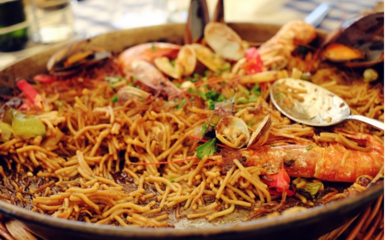 Cosa mangiare: paella. Uno dei piatti che per primi vengono in mente quando si pensa alla Spagna è l'immancabile paella. Valencia è in realtà il luogo di nascita di questa pietanza a base di riso, colorato dallo zafferano e insaporito da carne di pollo e coniglio, oltre che da diversi tipi di fagioli, nella sua versione originale. Fin dalla sua ideazione, sono comparse innumerevoli varianti, tra cui di pesce, mista e al nero di seppia.